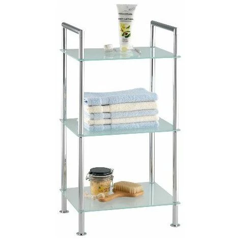 Zwei in einem ? dekorativ und praktisch bietet das edle Badregal Style aus Chrom viel Platz zum Ablegen und Aufbewahren.Auf den drei Ablagen aus satiniertem Sicherheitsglas schafft das Regal vielfältige Abstellmöglichkeiten für Kosmetikartikel, Bad-Accessoires und Handtücher.Das Regal besticht durch sein elegantes Chrom-Gestell mit stilvollem Eckdesign.