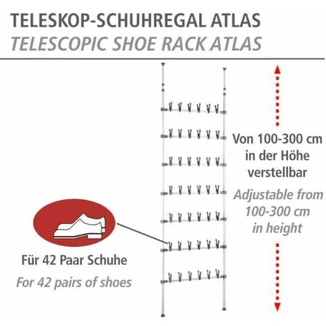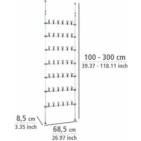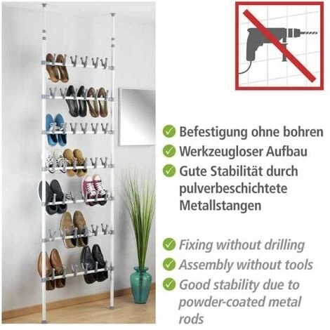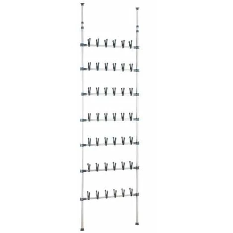 L’astucieuse étagère télescopique pour les chaussures et les bottes crée du rangement dans la buanderie, le garage, la cave … Où que vous souhaitiez ranger vos chaussures, l’étagère télescopique robuste offre beaucoup de place sur peu d’espace et peut être montée facilement sans outil. L’étagère à chaussures s’installe entre le sol et le plafond grâce à son réglage en hauteur en exerçant une torsion. Elle accueille en bas trois paires de bottes et, au-dessus de ces dernières, douze paires de chaussures. Les tablettes de rangement du haut offrent un emplacement pratique pour les sacs à mains, les écharpes, les gants et bien d’autres accessoires.