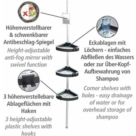 L’étagère de douche télescopique Wave de WENKO est l’article idéal pour être placé de manière décorative et universelle dans la douche ou la salle de bain. L’étagère de salle de bain est fabriquée en aluminium inox et plastique. Cette combinaison de matières fait naître une harmonie parfaite, mais surtout durable. Sur trois rayons dotés d’inserts fonctionnels, l’étagère offre beaucoup de place pour les gels de douche, les shampoings, les savons, les éponges ou d’autres accessoires de salle de bain. Les crochets intégrés sont appropriés pour les gants de toilette, les éponges de douches ou encore les brosses à mains. Un miroir possédant des propriétés antibuée est en outre disponible. Vous réussirez donc un rasage parfait même sous la douche et économiserez ainsi du temps. La barre télescopique vous donne de plus la possibilité de régler individuellement la taille de l’étagère. L’étagère télescopique est extensible en hauteur de 0,70 à 2,60 m. Le montage de l’angle de douche pratique réussit en quelques minutes : Il suffit de la fixer au sol et au plafond et c’est fini, sans perçage ou sans vissage. La commode étagère de douche bénéficie d’une garantie de 10 ans. Pour ce produit, vous bénéficiez d‘une garantie de 10 ans à compter de la date d‘achat. La garantie porte sur tous les vices de matériau et de fabrication qui altèrent le bon fonctionnement. Sont exclus les dommages résultant d‘un maniement incorrect ou de l‘usure naturelle. La garantie ne restreint aucune vos droits à la garantie légaux. En cas de garantie, veuillez renvoyer gratuitement l‘article accompagné du ticket de caisse et convenablement emballé pour le transport à l‘adresse suivante : Wenko-Wenselaar GmbH & Co. KG · Abteilung « Retouren » Im Hülsenfeld 10 · 40721 Hilden, Allemagne [email protected]