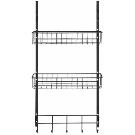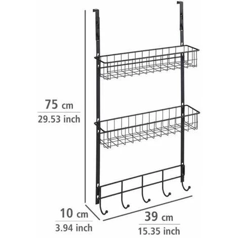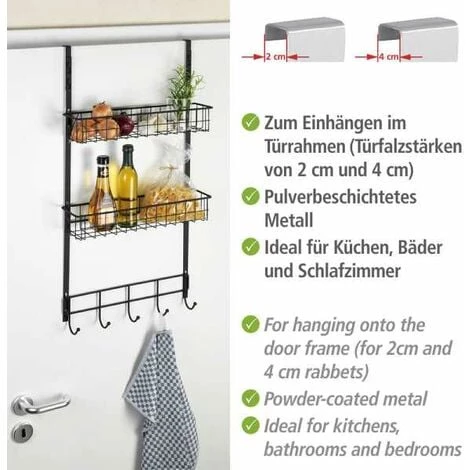 Design d’intérieur au plus haut niveau – l’étagère de porte noire tendance de style industriel confère à vos pièces ce petit quelque chose de particulier. Par son design linéaire et sa forte présence, l’étagère suspendue au fini noir tendance crée le contraste idéal avec les cuisines, les salles de bain et les chambres à coucher claires avec un facteur de bien-être. La moderne étagère suspendue avec deux paniers de rangement et cinq crochets met fin aux problèmes d’ordre. L’intelligente aide en métal de haute qualité, peint par poudrage, offre beaucoup de place et crée un espace de rangement supplémentaire. Dans la cuisine, les ustensiles de cuisine, les légumes, les épices et bien d’autres articles trouvent un emplacement bien ordonné. L’organiseur fait bonne mine dans la salle de bain également. Ici, les accessoires, les brosses, les serviettes d’invités, etc., trouvent à tout moment un emplacement décoratif. Les torchons vaisselle, débarbouillettes, serviettes de douche et peignoirs peuvent être accrochés sur les crochets pratiques, à portée de main. Particulièrement pratique : Le montage n’exige absolument aucun outil. L’étagère murale s’accroche tout simplement sur la porte. La livraison comprend des crochets haut de gamme à accrocher sur la porte. Les crochets sont adaptés pour des épaisseurs de feuillure de porte de 2 et 4 cm. Bien entendu, la porte se ferme facilement. Dimensions des paniers : 39,5 x 10 x 7 cm, distance entre les paniers 9 cm