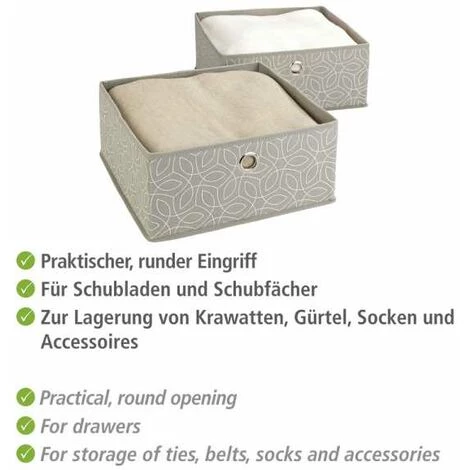 La polyvalente série d’articles de rangement Balance vous offre de nombreuses possibilités pour ranger les vêtements et les textiles à l’abri de la poussière, de manière respirante et sans encombrer. La série Balance séduit par son design esthétique et son système exhaustif de solutions de rangement pratiques – pour plus d’espace, mêmes dans les espaces les plus restreints. Tous les articles de la série de rangement Balance sont fabriqués en matière polaire respirante et robuste et sont conçus de manière optimale pour une utilisation soigneuse en déplacement ou à domicile. Le range-tiroir en pratique set de 2 unités de la série Balance offre beaucoup de place pour le rangement ordonné du linge, des chaussettes, des cravates, des ceintures et bien d’autres accessoires. Lorsqu’elles ne sont pas utilisées, les boîtes de rangement pour tiroirs peuvent être repliées à des dimensions peu encombrantes. La décorative série Balance de couleur taupe tendance au motif délicat offre une protection fiable contre la poussière, les mites et les influences extérieures telles que la saleté, etc. ainsi qu’un stockage sans plis ni froissement pour une apparence parfaitement soignés.
