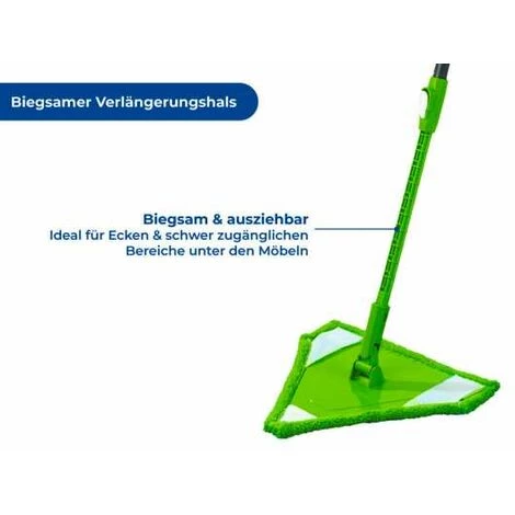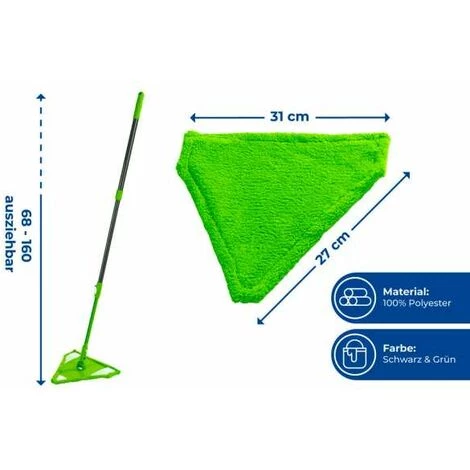 Avez-vous aussi toujours des difficultés à entrer dans les coins en nettoyant et en essuyant ? Avec le balai à franges Triangle, c’est désormais terminé. Le balai à franges est munie d’un cou de rallonge à la fois extensible et flexible et peut donc également être utilisé parfaitement pour nettoyer les endroits difficiles d’accès derrière les armoires ou sous les étagères. Le grand triangle de l’ingénieux balai à franges est idéal pour le nettoyage de grandes surfaces. Le manche télescopique extensible en continu (jusqu’à une longueur totale de 160 cm env.) permet des travaux ménagers simples et agréables pour le dos. La housse en microfibre de haute qualité, amovible, enlève même les saletés les plus tenaces et peut être lavée à 40°C. Pour ce produit, vous bénéficiez d’une garantie de 5 ans à compter de la date d’achat. La garantie porte sur tous les vices de matériau et de fabrication qui altèrent le bon fonctionnement. Sont exclus les dommages résultant d’un maniement incorrect ou de l’usure naturelle. La garantie ne restreint aucunement vos droits à la garantie légaux. En cas de garantie, veuillez renvoyer gratuitement l‘article accompagné du ticket de caisse et convenablement emballé pour le transport à l‘adresse suivante : Wenko-Wenselaar GmbH & Co. KG · Abteilung « Retouren » Im Hülsenfeld 10 · 40721 Hilden, Allemagne [email protected]