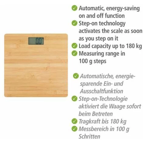 - Étendue de la livraison : Balance numérique Bambusa de WENKO, surface de plateau fabriquée en bambou de qualité supérieure, (L x h x l) : 30 x 2,7 x 30 cm, affichage LCD de 7,3 x 3,5 cm, piles fournies (2 x AAA), nature