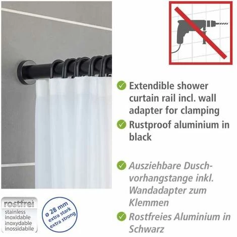 Pose simple et rapide du rideau de douche ou de baignoire – la barre de douche télescopique Luz de WENKO résout de manière flexible le problème des possibilités de suspension qui manquent pour les rideaux, en particulier dans la salle de bain. La barre de suspension au coloris noir esthétique, en aluminium inox, est réglable variablement de 70 à 115 cm de large et peut être facilement coincée entre deux murs. Les grands adaptateurs muraux au design puriste en matière plastique robuste, inclus dans la livraison, donnent à la barre de douche pour rideaux le soutien nécessaire. Grâce au diamètre de tube de 2,8 cm, le rideau est tenu en position de manière sûre et fiable pour intercepter les éclaboussures d’eau provenant de la douche et la baignoire. La barre à coincer peut également être utilisée dans d’autres pièces habitables. Par exemple, dans une niche à la garde-robe, chaussures et sacs restent dissimulés après l’accrochage d’un rideau. Mais, véritable artiste de la dissimulation, la tringle à rideaux peut également servir de cloison de séparation et être utilisée dans l’armoire-penderie. De cette manière, elle vous garantit de l’ordre dans l’ensemble du foyer. La barre de douche télescopique de WENKO est proposée en d’autres couleurs et tailles. Le complément idéal pour la douche et la baignoire sont les rideaux de douche de WENKO, qui sont proposés en de nombreux coloris et motifs. Parfaits en tant qu’équipement complet pour chaque salle de bain ou WC d’invités. Pour ce produit, vous bénéficiez d’une garantie de 5 ans à compter de la date d’achat. La garantie porte sur tous les vices de matériau et de fabrication qui altèrent le bon fonctionnement. Sont exclus les dommages résultant d’un maniement incorrect ou de l’usure naturelle. La garantie ne restreint aucunement vos droits à la garantie légaux. En cas de garantie, veuillez renvoyer gratuitement l’article accompagné du ticket de caisse et convenablement emballé pour le transport à l’adresse suivante : Wenko-Wenselaar GmbH & Co. KG – Service « Retouren » – Im Hülsenfeld 10 – 40721 Hilden [email protected]