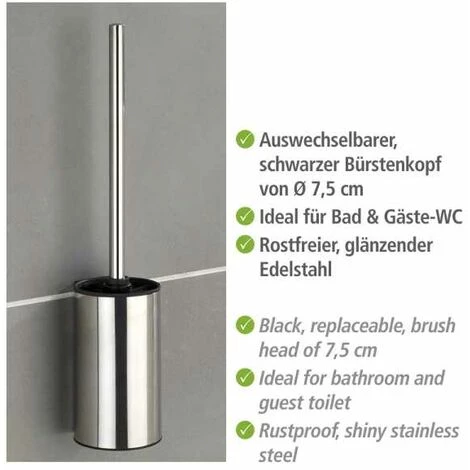Le système de fixation murale Turbo-Loc® de WENKO offre des accessoires de salle de bain décoratifs, qui se fixent facilement au mur – sans vis, sans percer de trous et sans chevilles. La série de fixation Turbo-Loc® se caractérise par une adhérence forte sur toutes les surfaces lisses et légèrement structurées. Le tampon adhésif spécial permet une pose rapide et simple (disponible sans temps d’attente) et il peut être démonté à nouveau sans laisser de traces. Il peut supporter une force de traction atteignant 40 KG. L’ensemble WC exclusif Turbo-Loc® Detroit se caractérise par sa qualité supérieure en acier inox. Le support en acier inox brillant tient la brosse WC en tout moment à portée de main, de manière décorative. La brosse WC avec tête de brosse remplaçable blanche de Ø 7,5 cm est comprise dans la livraison. La série d’accessoires de salle de bain Detroit vous apporte un design noble La série de 3 articles, composé d’un distributeur de savon, d’un ensemble WC et d’un porte-rouleaux de rechange, est fabriquée en acier inox élégant combiné avec des éléments en matière plastique noirs. En alternative à la fixation avec les tampons adhésifs Turbo-Loc®, la livraison comprend également des vis et des chevilles pour la fixation murale.