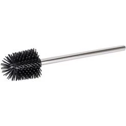 La brosse WC haut de gamme est idéale comme brosse de rechange pour les ensembles WC. Le manche est fabriqué en acier inox brillant. La brosse est en outre dotée d’une tête remplaçable noire de Ø 8,5 cm De qualité élevée, la tête de brosse noire est fabriquée en silicone. Son effet antiadhésif spécial empêche l’incrustation de résidus persévérants et de papier hygiénique dans la brosse, ces derniers sont emportés tout simplement lors du nettoyage. Ainsi, la brosse intelligente se nettoie elle même et conserve une propreté hygiénique irréprochable. Grâce à cette brosse WC pratique, il devient possible de nettoyer le WC en profondeur. La brosse garantit une utilisation fiable grâce à ses poils en silicone à la fois robustes et flexibles.
