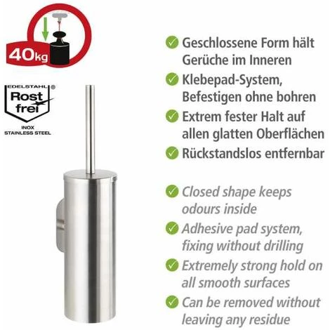 L’ingénieux système de fixation murale Turbo-Loc® de WENKO propose des accessoires de salle de bain et des tablettes de rangement décoratifs, qui se fixent facilement au mur – sans vis, sans percer de trous et sans chevilles. La fixation est un jeu d’enfants. La fixation murale Turbo-Loc® est un système de collage offrant une adhérence extrêmement forte sur toutes les surfaces lisses. Décoller simplement le film de protection du tampon autoadhésif, fixer le support à l’endroit souhaité et presser. Le tampon adhésif se décolle à nouveau sans laisser de traces. Grâce au système à tampon adhésif spécial, les ustensiles de salle de bain peuvent durablement porter des charges. Avec la série d’accessoires de salle de bain de haute qualité Orea, conférez à votre maison un nouveau style de vie. Désormais, une clarté moderne trouvera son chemin dans votre salle de bain et votre WC d’invités. Et les aides de salle de bain stylées allient fonctionnalité et qualité. La série d’articles de salle de bain est fabriquée en acier inox de qualité supérieure, qui n’est pas seulement noble par son apparence, mais aussi 100% inox. Le fini mat confère à votre salle de bain le petit plus. L’ensemble WC Orea garantit le nettoyage en profondeur des toilettes. La brosse WC garantit une utilisation fiable grâce à ses poils à la fois robustes et flexibles. Grâce à la forme fermée, la brosse n’est pas directement visible et les odeurs ne peuvent pas se répandre à l’extérieur. Le porte-brosse WC tient la brosse WC de manière décorative à portée de main, à l’endroit souhaité. La livraison comprend une brosse WC à tête remplaçable blanche de Ø 8,5 cm. Pour ce produit, vous bénéficiez d’une garantie de 10 ans à compter de la date d’achat. La garantie porte sur tous les vices de matériau et de fabrication qui altèrent le bon fonctionnement. Sont exclus les dommages résultant d’un maniement incorrect ou de l’usure naturelle. La garantie ne restreint aucunement vos droits à la garantie légaux. Bien d’autres articles de la série Turbo-Loc® Orea de WENKO sont disponibles pour cet accessoire. En cas de garantie, veuillez renvoyer gratuitement l‘article accompagné du ticket de caisse et convenablement emballé pour le transport à l‘adresse suivante : Wenko-Wenselaar GmbH & Co. KG · Abteilung « Retouren » Im Hülsenfeld 10 · 40721 Hilden, Allemagne [email protected]