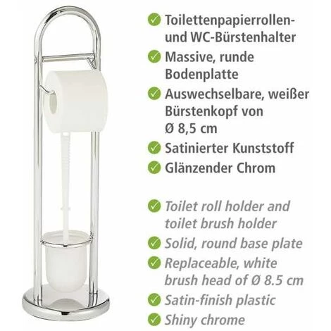 Le combiné WC sur pied exclusif Siena est l’indispensable de vos toilettes avec son dérouleur et sa brosse WC. Absolument autonome et stable, il se positionne facilement dans tous les recoins des WC. Design et pratique, il est composé de 2 parties : un dérouleur de papier hygiénique sur sa partie haute et brosse WC dans son réservoir en partie basse. La brosse WC et son réservoir sont en plastique mat pour faciliter le nettoyage. Pour plus de durabilité et d’hygiène, la tête de brosse en plastique (Ø 8,5 cm) est remplaçable.