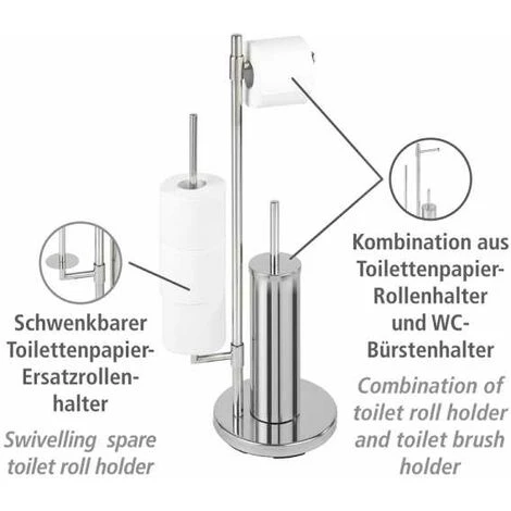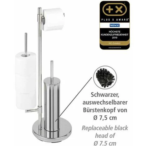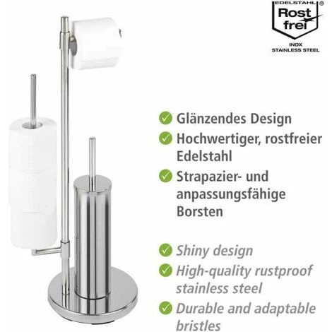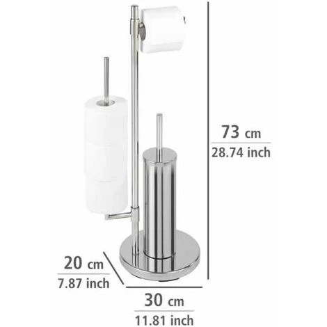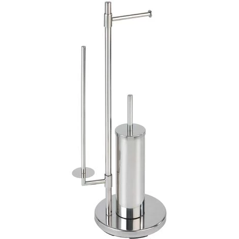 Le serviteur WC sur pied Universalo Neo apporte une touche design dans vos toilettes. Cet indispensable combiné WC 3-en-1 est composé d’un porte brosse WC fermé, d’un porte papier toilette et un porte-rouleaux de rechange pivotant permettant de stocker jusqu’à 3 rouleaux supplémentaires. Fabriqué en acier inox haut de gamme, le combiné WC apporte fonctionnalité et design. L’inox est réputé pour être facile d’entretien et résister à l’humidité, il est 100% antirouille. Ce combiné WC sur pied vous apportera un gain de place considérable et trouvera sa place dans tous les WCs ou salles de bain. Le pied lesté assure au serviteur WC une bonne stabilité. La livraison comprend la brosse WC à tête remplaçable blanche de Ø 7,5 cm et un manche chromé.