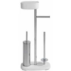 L’ensemble WC sur pied de qualité supérieure Rivazza est fabriqué en acier inox de qualité supérieure combiné à une matière plastique blanche. L’ensemble WC convainc par sa fonctionnalité et son design et place des accents décoratifs dans la salle de bain et le WC d’invités. L’ensemble offre 5 fonctions et il est donc idéal pour les petites salles de bain. En plus de l’ensemble WC fermé, du porte-rouleaux de papier hygiénique ouvert pour un prélèvement immédiat et du compartiment pour rouleaux de rechange pour ranger jusqu’à trois rouleaux supplémentaires, la boîte intelligente offre un espace de rangement supplémentaire pour le papier toilette humide, les articles d’hygiène féminine ou bien d’autres ustensiles. Le couvercle pratique sert en même temps de surface de rangement pour les téléphones portables et autres. Le pied noir garantit à l’ensemble WC un positionnement stable. La livraison comprend la brosse WC à tête remplaçable noire de Ø 6,5 cm. Envie d’un peu plus de couleurs ? Kein Problem – l’ensemble WC sur pied Rivazza est également proposé avec un beau coloris noir élégant.