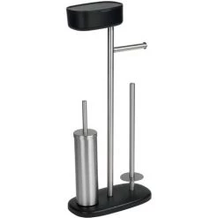 L’ensemble WC sur pied de qualité supérieure Rivazza est fabriqué en acier inox de qualité supérieure combiné à une matière plastique noire. L’ensemble WC convainc par sa fonctionnalité et son design et place des accents décoratifs dans la salle de bain et le WC d’invités. L’ensemble offre 5 fonctions et il est donc idéal pour les petites salles de bain. En plus de l’ensemble WC fermé, du porte-rouleaux de papier hygiénique ouvert pour un prélèvement immédiat et du compartiment pour rouleaux de rechange pour ranger jusqu’à trois rouleaux supplémentaires, la boîte intelligente offre un espace de rangement supplémentaire pour le papier toilette humide, les articles d’hygiène féminine ou bien d’autres ustensiles. Le couvercle pratique sert en même temps de surface de rangement pour les téléphones portables et autres. Le pied noir garantit à l’ensemble WC un positionnement stable. La livraison comprend la brosse WC à tête remplaçable noire de Ø 6,5 cm. Envie d’un peu plus de couleurs ? Pas de problème – l’ensemble WC sur pied Rivazza est également proposé avec un coloris blanc classique.