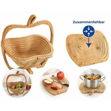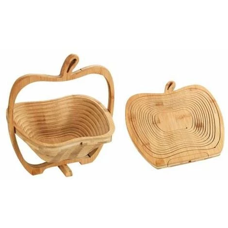 Les fruits et les légumes sont les éléments les plus importants d’une alimentation saine et équilibrée. Les différents fruits et légumes deviennent encore plus savoureux s’ils sont également joliment drapés. Que diriez-vous du panier à fruits en bambou repliable de WENKO ? Ce merveilleux panier à fruits n’est pas seulement très beau et n’offre pas seulement aux fruits et légumes un remarquable emplacement de rangement, mais il se transforme aussi en quelques secondes seulement en un dessous de plat. La forme de pomme décorative du panier pliant en bambou lui donne un aspect attrayant – quel que soit l’endroit où vous placez ce panier. Utilisez le panier déployé en tant que panier à fruits, à légumes ou à petits pains. Et cette pratique aide fait aussi une excellente coupe décorative. Lorsque vous repliez le panier, vous pouvez l’utiliser en tant que dessous de plat ou planche à découper ou simplement le ranger sans qu’il vous encombre. Grâce à la boucle pratique sur l’anse, le panier pliant peut être à la fois placé et accroché. Le pied rotatif lui garantit sa stabilité. Le panier à fruits est fabriqué en bambou durable et est à la fois adapté pour les aliments et naturellement antibactérien. Le matériau offre également des avantages évidents d’un point de vue écologique : Le bambou est une matière première rapidement renouvelable et absolument tendance. Dimensions (L x H x P) : déployé 26,5 x 30 x 22,5 cm ; déplié 26,5 x 1,5 x 29,5 cm