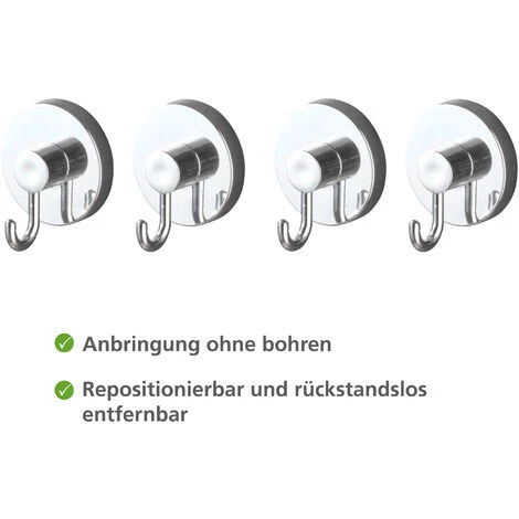 Un peu plus d’ordre dans la salle de bain ? Pas de problème grâce aux crochets brillants de la série Vacuum-Loc®. Les crochets en set pratique de 4 sont appropriés pour servir de petit porte-vêtements dans la salle de bain, comme support de suspension pour le peignoir, les serviettes et bien d’autres articles encore. La nouveauté mondiale en matière de technologie de fixation s’appelle Vacuum-Loc® ! Ce système unique en son genre la fixation rapide, aisée et fiable des accessoires sur tous les supports imperméables à l’air et légèrement irréguliers. Le nouveau système Vacuum-Loc® se compose d’une pompe et de verrous de fixation, il n’est pas nécessaire de percer ou de visser, aucun ventouse n’est nécessaire. Les Vacuum-Loc®s se repositionnent à volonté et se démontent sans laisser de résidus. Le système Vacuum-Loc® est protégé par un brevet européen et vous garantit une fixation fiable. Chaque verrou de fixation peut, à long terme, supporter un effort de traction atteignant 33 kg.