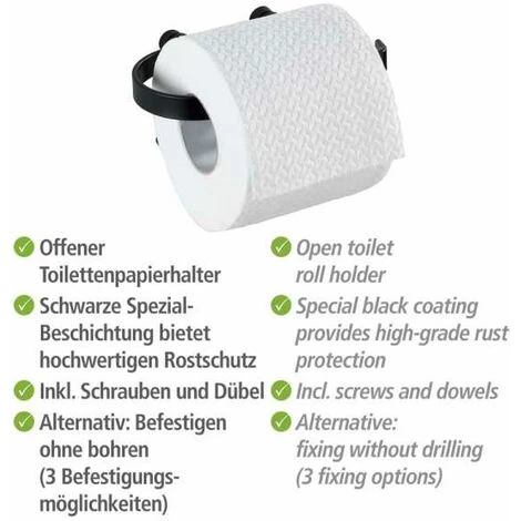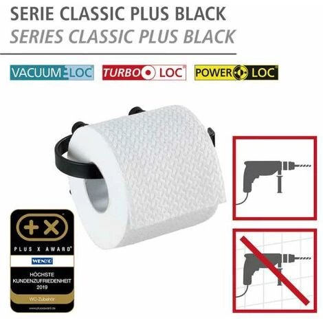 L’innovante série Classic Plus Black de WENKO allie des formes tendance à une qualité triée sur le volet. Les accessoires de salle de bain de cette série en acier sont pourvus d’un revêtement spécial noir, qui leur garantit une protection efficace contre la rouille. La série de salle de bain tendance, de style industriel, confère à toutes les pièces la petite note particulière. Par leur design linéaire et leur forte présence, les accessoires créent le contraste idéal avec les cuisines et les salles de bain claires. Le pratique porte-rouleaux de papier hygiénique Classic Plus Black tient le papier hygiénique à portée de main dans la salle de bain et le WC d’invités. Le rouleau de papier hygiénique se glisse tout simplement sur le pratique porte-rouleaux et voilà que le papier peut être prélevé selon le besoin. La livraison comprend des vis et des chevilles pour le montage mural. Le système Classic Plus propose en alternative trois autres possibilités pour la fixation – sans percer de trous. Les adaptateurs appropriés suivants sont proposés séparément : Variante 1 : Adaptateur Vacuum-Loc (numéro d’article : 23891100) L’exceptionnel système d’aspiration à vide permet une fixation rapide, simple et fiable des accessoires et garantit une adhérence forte sur les surfaces imperméables à l’air, planes et légèrement irrégulières. Variante 2 : Adaptateur Turbo-Loc (numéro d’article : 23889100) La fixation murale Turbo-Loc est un système à tampon adhésif spécial offrant une adhérence extrêmement forte sur toutes les surfaces lisses. Variante 3 : Adaptateur Power-Loc (numéro d’article : 23890100) Agréé par le TÜV, le système de collage à chambres Power-Loc se caractérise par une fixation extrêmement rigide sur toutes les surfaces résistantes, telles que les carrelages, la pierre naturelle, le verre, le béton, le métal, le bois et de nombreux plastiques. Le système de fixation adhère sans problème même sur les surfaces rugueuses et légèrement inégales. À vous de décider ! Si vous choisissez l’une des variantes sans perçage de trous, veuillez commander séparément l’adaptateur correspondant. Ou utilisez tout simplement le matériel de fixation fourni. Pour ce produit, vous bénéficiez d’une garantie de 3 ans à compter de la date d’achat. La garantie porte sur tous les vices de matériau et de fabrication qui altèrent le bon fonctionnement. Sont exclus les dommages résultant d’un maniement incorrect ou de l’usure naturelle. La garantie ne restreint aucunement vos droits à la garantie légaux. En cas de garantie, veuillez renvoyer gratuitement l‘article accompagné du ticket de caisse et convenablement emballé pour le transport à l‘adresse suivante : Wenko-Wenselaar GmbH & Co. KG · Abteilung « Retouren » Im Hülsenfeld 10 · 40721 Hilden, Allemagne [email protected]