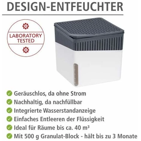 - Effet immédiat pendant une durée atteignant 2 mois, sans consommation de courant électrique (500 g de chlorure de calcium), pour toutes les pièces de jusqu’à 40 m³, rechargeable