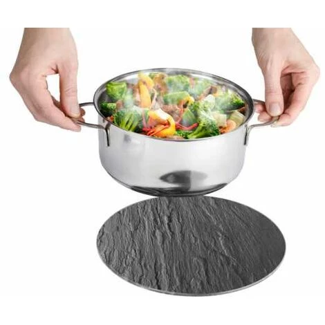 Le dessous de plat de qualité supérieur, avec son effet ardoise, apporte une touche décorative fonctionnelle dans chaque cuisine et sur chaque table ! D’un diamètre de 20 cm, le dessous de plat en verre protège efficacement la table et le plan de travail contre les poêles et les casseroles chaudes. Poser tout simplement le dessous de plat sur la table et cette dernière est dressée. Le dessous de plat design est fabriqué en verre trempé. Ses quatre pieds antidérapants en silicone garantissent aux casseroles et aux poêles un positionnement stable, sans risque de glisser. Grâce à une suspension au dos du dessous de plat, celui ci peut également être installé au mur comme élément décoratif lorsqu’il n’est pas utilisé.