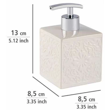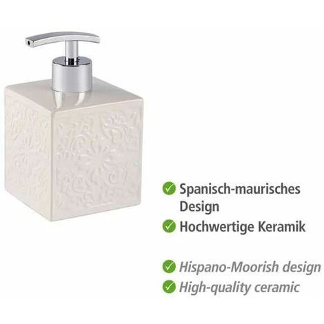 Les accessoires de salle de bain haut de gamme de la série Cordoba convainquent par leur finition noble en céramique haut de gamme, avec une surface à structures fines au design espagnole-mauresque. Avec ces accessoires de salle de bain aux finitions soignées, de couleur blanche discrète, vous apportez un peu d’histoire contemporaine dans la salle de bain ou le WC d’invités. Le distributeur de savon haut de gamme Cordoba confère à chaque ménage une élégance moderne et sera à coup sûr un accroche-regard. Le pratique distributeur de savon blanc peut être rempli spécifiquement jusqu’à 500 ml de savon liquide ou de lotion de douche et il est rechargeable à tout moment. Une légère pression sur le bouton de dosage délivre la quantité de savon ou de lotion souhaitée. Le charmant distributeur de savon fait bonne mine dans la cuisine également, par exemple près de l’évier. Remplissez-le tout simplement de liquide vaisselle et vous pouvez mettre au rancart vos anciens flacons de liquide vaisselle en plastique. Le beau doseur de savon de WENKO se combine parfaitement avec le gobelet à brosser les dents et l’ensemble WC Cordoba de WENKO.l: 8,5 cm x H: 13 cm x P: 8,5 cm