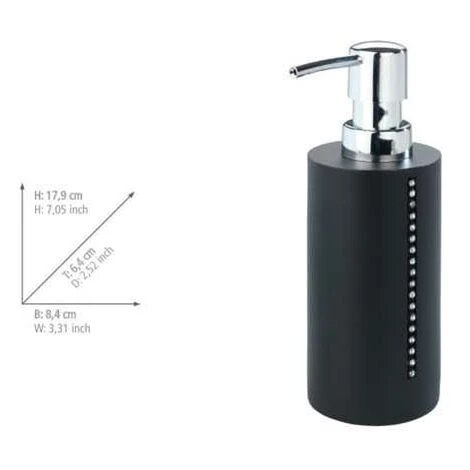 La série Diamond confère à la salle de bain un design noble avec une note de glamour. Le distributeur de savon décoratif est en polyrésine noire haut de gamme, décorée de strass. Il peut être rempli spécifiquement de jusqu’à 210 ml de savon liquide ou de lotion. Une légère pression sur le bouton de dosage délivre la quantité de savon souhaitée.l: 8,4 cm x H: 17,9 cm x P: 6,4 cm