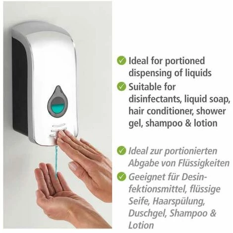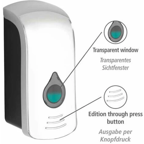 - Utilisation facile : Le maniement hygiénique s’effectue par simple pression sur un bouton et la quantité de liquide souhaitée est distribuée. Le distributeur de désinfectant ne goutte pas et fonctionne sans piles.