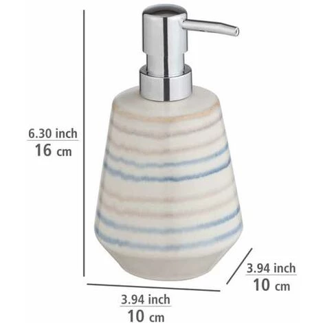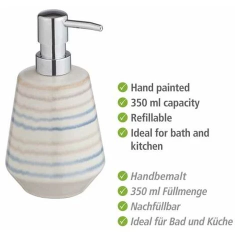 - Étendue de la livraison : Distributeur de savon Navalon de WENKO, en céramique haut de gamme, rechargeable jusqu’à 350 ml de savon liquide, distributeur de savon liquide maritime pour le savon à main, (L/H x P) : Ø 10 x 16 cm, multicolore