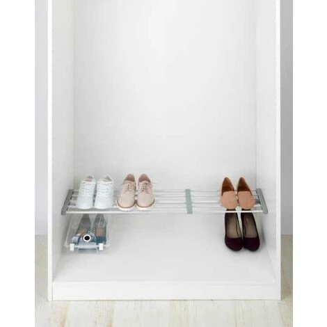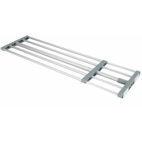 - Utilisation multifonctionnelle : Les possibilités de rangement ouvertes sont multiples ! La surface de rangement télescopique offre un espace de rangement, que ce soit dans la salle de bain, la chambre à coucher, le couloir ou la cuisine. Par exemple, des chapeaux, des sacs ou des écharpes peuvent être soigneusement rangés sur l’étagère de 23 cm de profondeur. Les cinq tubes en aluminium de l’étagère à caler offrent également un espace supplémentaire pour suspendre des cintres, des écharpes ou des cravates. À l’intérieur d’une armoire, cette étagère fait également office d’étagère à chaussures ou de porte accessoire.