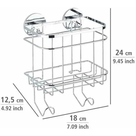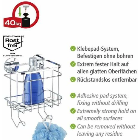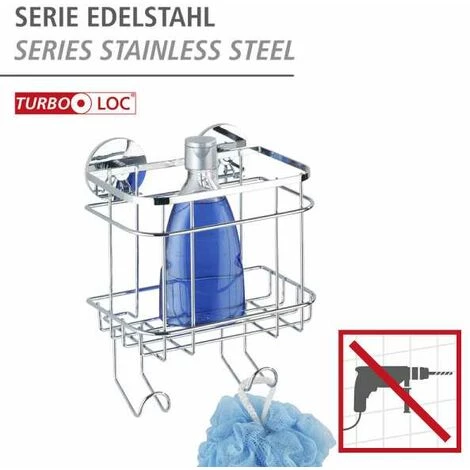 Le système de fixation murale Turbo-Loc® offre des accessoires et des tablettes décoratifs, qui se fixent facilement au mur – sans vis, sans percer et sans chevilles. La fixation est un jeu d’enfants. La fixation murale Turbo-Loc® est un système de collage avec une fixation extrêmement rigide sur toutes les surfaces lisses. Pour le collage, il suffit de retirer le film de protection du tampon autocollant, de fixer le support à l’endroit souhaité et de presser. Ensuite, il ne reste plus qu’à accrocher l’accessoire. Le tampon autocollant peut être décollé sans laisser de résidus. Grâce au système de tampon adhésif spécial, les crochets de fixation peuvent, à long terme, supporter chacun un effort de traction atteignant 40 kg. Le décoratif panier mural Turbo-Loc® a un design très noble grâce à son acier inox brillant de qualité supérieure. Le rayon mural permet de ranger bien en ordre tous les ustensiles de bain et de soins. Particulièrement pratique : le panier haut garantit pour une meilleure stabilité du shampoing, du gel de douche, de la lotion corporelle, etc. Les deux crochets tiennent en plus l’éponge ou l’éponge de bain à portée de main. Évidemment, le panier mural Turbo-Loc® bénéficie d’une garantie de 5 ans. Pour ce produit, vous bénéficiez d‘une garantie de 5 ans à compter de la date d‘achat. La garantie porte sur tous les vices de matériau et de fabrication qui altèrent le bon fonctionnement. Sont exclus les dommages résultant d‘un maniement incorrect ou de l‘usure naturelle. La garantie ne restreint aucune vos droits à la garantie légaux. En cas de garantie, veuillez renvoyer gratuitement l‘article accompagné du ticket de caisse et convenablement emballé pour le transport à l‘adresse suivante : Wenko-Wenselaar GmbH & Co. KG · Abteilung « Retouren » Im Hülsenfeld 10 · 40721 Hilden, Allemagne [email protected]: 18 cm x H: 24 cm x P: 12,5 cm