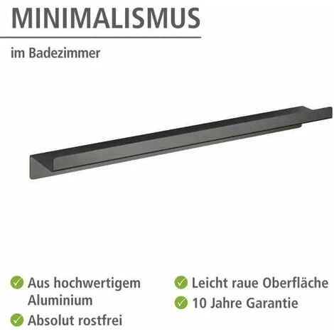 Minimalisme dans la salle de bain – la série d’accessoires de salle de bain Montella allie des formes claires à des matériaux de haute qualité, et suit la tendance du mobilier puriste avec des accents de couleurs foncées. Le design rectangulaire ave c des bords arrondis et la surface légèrement rugueuse confèrent à la série un aspect particulièrement moderne. Entièrement en anthracite, les accessoires ne garantissent pas seulement l’ordre, ils apportent aussi un design élégant dans la salle de bain. Fabriquée en aluminium de haute qualité, la série Montella est absolument inoxydable et peut parfaitement être utilisée dans les locaux humides. La discrète tablette de rangement maxi de la série offre, par sa longueur de 50 cm, de la place pour les flacons de shampoing, les produits cosmétiques ou bien autres ustensiles dans la salle de bain. L’étagère mince est idéale comme tablette de rangement au-dessus du lavabo, mais peut également être utilisée dans la douche, la baignoire ou à l’évier de cuisine. La tablette de rangement se monte au mur à l’aide de vis et de chevilles. Le matériel de fixation est compris dans la livraison. D’autres articles de la série Montella de WENKO sont disponibles pour cet accessoire. Pour ce produit, vous bénéficiez d’une garantie de 10 ans à compter de la date d’achat. La garantie porte sur tous les vices de matériau et de fabrication qui altèrent le bon fonctionnement. Sont exclus les dommages résultant d’un maniement incorrect ou de l’usure naturelle. La garantie ne restreint aucunement vos droits à la garantie légaux. En cas de garantie, veuillez renvoyer gratuitement l‘article accompagné du ticket de caisse et convenablement emballé pour le transport à l‘adresse suivante : Wenko-Wenselaar GmbH & Co. KG · Abteilung « Retouren » Im Hülsenfeld 10 · 40721 Hilden, Allemagne [email protected]