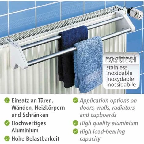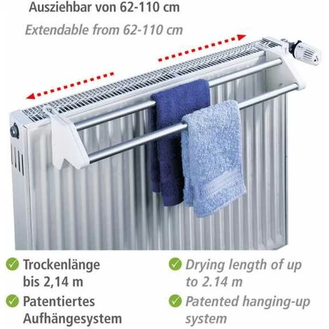 Le séchoir pour radiateur est extensible de 57 à 104 cm et dispose d’une longueur d’étendage allant jusqu’à 2,14 mètres. Grâce à ses systèmes de suspension brevetés, il propose des utilisations polyvalentes, par ex. sur les portes, les murs, les radiateurs et les armoires. Grâce à sa composition en aluminium haut de gamme, ce séchoir est 100 % inoxydable et facile d’entretien, tout en étant très résistant. Le séchoir est également simple à monter.