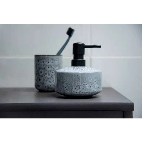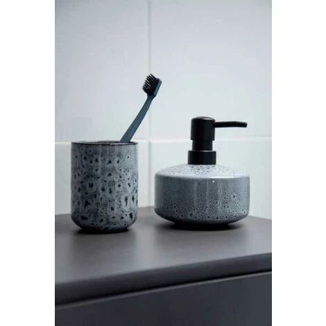 Oviedo – chaque article une pièce unique. Le procédé de glaçure spécial fait de chaque accessoire de salle de bain une pièce unique. La surface unique en son genre, avec des variations de couleurs et de motifs, confère à chaque produit et donc à toute la série un charme particulier. Ne sommes-nous pas tous à la recherche de quelque chose d’unique ? Par cette série d’articles de salle de bain, WENKO répond à ce besoin d’individualité. Le gobelet à brosser les dents, d’une beauté frappante, séduit par des nuances inhabituelles dans un mélange de gris, de bleu et de vert. L’accroche-regard est créé par les pois noirs dont il est parsemé au hasard, qui migrent de bas en haut – peut-être même reconnaissez-vous un certain look Léo ? L’intérieur du gobelet convainc également grâce à sa couleur semblable à celle du ciment, en combinaison avec des pois de différentes tailles. Le bord du gobelet, en contraste sombre avec le gobelet, complète cet impressionnant design. L’extravagant gobelet à brosser les dents mesure Ø 7,5 x 9,5 cm et est parfaitement conçu pour donner à vos ustensiles de soins dentaires un emplacement bien ordonné. Pourquoi ne pas offrir également à vos invités la possibilité de ranger leur propre brosse à dents de manière esthétique dans votre WC d’invités ? Le sensationnel accessoire de salle de bain est fabriqué en céramique haut de gamme. De cette manière, une stabilité sûre est garantie, que ce soit sur le bord du lavabo ou sur la tablette de rangement de salle de bain – la brosse à dents et la pâte dentifrice sont magnifiquement rangés à portée de main immédiate. Avec la série d’articles de salle de bain Oviedo de WENKO, vous faites entrer l’exclusivité dans votre salle de bain. Complétez l’ambiance de première classe avec le distributeur de savon hors du commun et l’impressionnant ensemble WC. Des impressions aux facettes multiples sont garanties !
