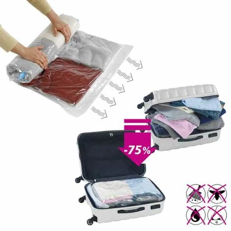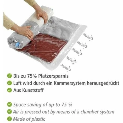Lorsque l’espace disponible est compté, il s’avère quelquefois nécessaire de purger l’air. Le système de compression Roll résout les problèmes de place en un tour de main. Il suffit d’y placer les vêtements, de fermer le système et de presser. L’air est purgé par le biais d’un système à chambres. Ainsi, l’on obtient jusqu’à 75 % de place en plus très facilement. Le sachet réduit la taille des vêtements au minimum, tout en les tenant à l’écart de la poussière et des mites. En outre, les vêtements ne froissent pas. Les vêtements reprennent leur volume initial dès qu’ils sont sortis du sachet. Le sachet transparent permet de garder un aperçu du contenu sans devoir l’ouvrir. Ce petit miracle en termes de gain de place est idéal pour les voyages ou les déplacements : Matériau : PE, dimensions : 50 x 70 cm