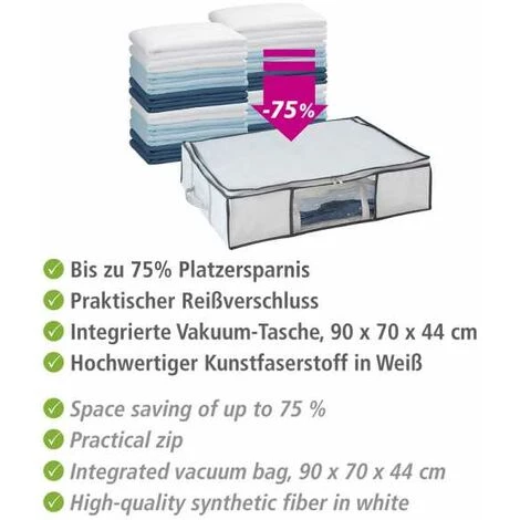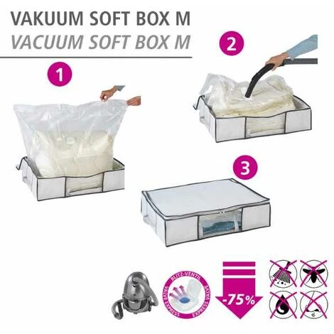 Économies d’espace et rangement à l’abri de la poussière par un seul article, voilà ce que vous offre la boîte de rangement Vacuum Soft Box M. La boîte intègre un sac sous vide avec valve express, qui peut être fermé simplement par aspiration après le remplissage. La vanne d’air empêche l’infiltration d’air depuis l’extérieur et assure ainsi une protection durable. La boîte de rangement Vacuum Soft Box M pour permet de réaliser une économie d’espace allant jusqu’à 75 %. En cas de besoin, il suffit simplement d’ouvrir la boîte et les vêtements sont à nouveau immédiatement disponibles.l: 65 cm x H: 15 cm x P: 50 cm