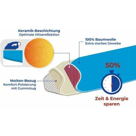 - Revêtement céramique pour un repassage plus rapide : La housse en coton, de haute qualité, est pourvue d’un revêtement céramique garantissant une réflexion optimale de la chaleur, qui permet d’économiser jusqu’à 50 % de temps grâce à l’effet de contre-repassage