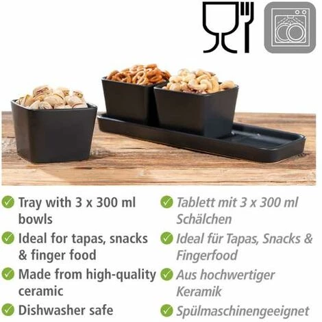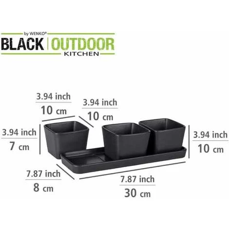BLACK OUTDOOR KITCHEN by WENKO – voici les produits astucieux qui ont leur place dans votre cuisine extérieure et qui sont indispensables pour vos grillades et vos brunchs. Avec les ustensiles de la série Black Outdoor Kitchen, WENKO vous propose le pack complet en accessoires pour faire la cuisine et des grillades, et qui apporteront des fonctionnalités supplémentaires à votre cuisine extérieure. Snack it and dip Le kit en 4 pièces des bols Snack & Dip comporte un joli plateau avec 3 petits bols d’une contenance de 300 ml chacun. C’est pourquoi cet arrangement est idéal pour les dips, les crackers et les olives à côté du grill. Si une petite faim se fait sentir après un grand repas, vous et vos invités serez parfaitement servis. Les dimensions globales des bols et du plateau sont (l x h x p) : 30 x 10 x 8 cm. Le plateau a les dimensions (l x L) : 30,5 x 10 cm. Les trois petits bols ont chacun un volume de 300 ml et possèdent les dimensions (l x h x p) 10 x 7 x 10 cm. Vaisselle de haute qualité Non seulement le plateau mais également les trois petits bols pour amuse-bouches ont été fabriqués en céramique de haute qualité noire à finition mate. Ce design permet une intégration visuelle parfaite du kit de bols au concept de la Black Outdoor Kitchen. Les accessoires conviennent parfaitement pour des repas chauds, car ils peuvent passer au micro-ondes. Ensuite, il vous suffira de laver les accessoires de cuisine au lave-vaisselle. Un équipement complet La série pour cuisines extérieures comprend de fabuleux accessoires de WENKO dont nous sommes convaincus qu’ils offrent une plus-value absolue sur le plan fonctionnel et visuel. À commencer par la préparation des plats jusqu’au transport facile vers la table. Ici, les trajets devraient être aussi simples que possible : des trajets longs pour retourner à la cuisine sont de l’histoire ancienne. Tout y est pour réaliser les tâches comme la préparation facile des grillades, le transport facile d’épices, de bols et de saladiers, le service esthétiquement agréable des plats, sans oublier les accessoires utiles pour un nettoyage agréable de la vaisselle. Un avantage particulier est que la séléction d’articles de la série se complètent parfaitement : essayez et équipez votre cuisine extérieure avec les articles Black Outdoor Kitchen de WENKO !