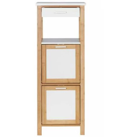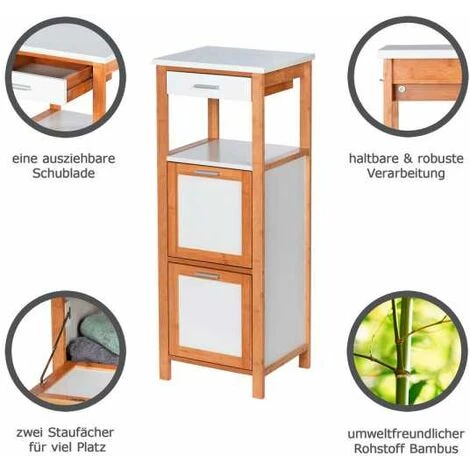 La charmante série d’articles de petits mobiliers Finja dans le style Scandinave tendance apporte toute la culture de l’habitat nordique avec simplicité formelle, minimalisme et fonctionnalité dans toute la maison. WENKO a accordé une grande importance à la qualité – c’est exactement ce pourquoi la série de meubles Finja est également particulièrement durable et résistante, tout en présentant des formes simples mais harmonieuses. Tous les articles d’ameublement sont fabriqué en bambou de qualité supérieure, qui est à la fois dur et résistant. Tous les meubles de la série Finja offre également des avantages clairs en termes d’écologie : le bambou est une matière première rapidement renouvelable et absolument tendance. Les tablettes de rangement en MDF présentent un coloris blanc sobre. Design, l’étagère sur pied Finja offre sur ses deux tablettes de rangement, deux compartiments de rangement et son tiroir beaucoup de place pour les serviettes, les livres, les ustensiles de cuisine, les produits cosmétiques, les accessoires et les articles décoratifs. Que vous la placiez dans la salle de bain, la chambre à coucher, le couloir, la cuisine ou la salle de séjour, la charmante étagère sera toujours parfaite et s’utilisera de manière polyvalente.