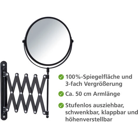 Le coup d’oeil quotidien dans le miroir fait partie du programme de soins quotidiens tant pour les hommes que pour les femmes. Le miroir cosmétique mural Exclusiv de WENKO, qui est doté d’un bras télescopique, offre une synthèse de fonctionnalité et d’esthétique du design. En plus de la surface de miroir de 100% et d’un triple grossissement, le miroir propose également, pour une utilisation cosmétique parfaite, un bras télescopique pratique, à la fois pivotant et réglable en hauteur en continu (longueur du bras d’env. 50 cm). La surface de miroir a un diamètre de 16 cm. Le miroir commode devient ainsi une aide utile lors des applications cosmétiques, du maquillage et du rasage. Le design en acier verni noir, au style industriel, donne à vos pièces ce petit quelque chose de particulier.