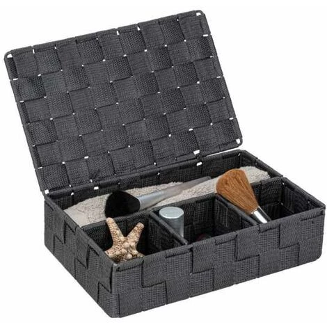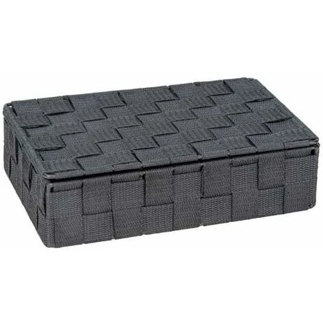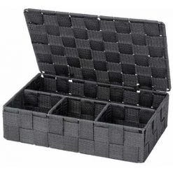 L’ordre met de bonne humeur : Le magnifique panier Adria Petit avec couvercle apporte un nouveau look à l’ensemble de la maison par sa couleur grise foncée tendance et minimaliste. La division pratique, dans le sens de la longueur, avec trois petits et un grand compartiments, garantit un rangement bien ordonné de tous les ustensiles. Dans la salle de bain, le panier de rangement en matière plastique tressée haut de gamme (polypropylène) apporte style et ordre pour le rangement des accessoires de salle de bain, des brosses ou des pinces à cheveux. Les produits cosmétiques et autres disparaissent tout simplement dans le panier ! Dans la chambre d’enfants, il peut servir à collecter de manière ordonnée les petites pièces de jouets. Dans les armoires-penderies également, la boîte décorative aide à ranger dans l’ordre bijoux, linge et chaussettes. Et dans la cuisine, les petits ustensiles de cuisine, tels que les stylos, les feuilles et bien d’autres encore, y trouveront un emplacement esthétique. Grâce au couvercle pratique, le contenu du panier de rangement est toujours à l’abri des regards indiscrets ! Ainsi, tous les ustensiles sont rangés discrètement et fiablement. Que diriez-vous d’un peu plus d’ordre ? Les pratiques paniers de WENKO sont empilables et peuvent ainsi être rangés sans encombrer.