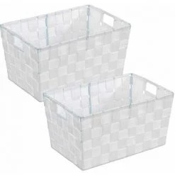 Le panier tendance blanc apporte une esthétique nouvelle dans l’ensemble du ménage. Dans la salle de bain, le panier en matière plastique tressée haut de gamme (polypropylène) apporte style et ordre pour le rangement des serviettes d’invités ou des accessoires de salle de bain. Dans la chambre d’enfants, il peut servir à collecter de manière ordonnée les petites pièces de jouets. Dans les armoires-penderies également, la boîte décorative aide à ranger dans l’ordre linge et chaussettes. Dans la cuisine, les ustensiles de cuisine y trouvent un emplacement esthétique. Veuillez noter que les informations de dimensions se rapportent aux points les plus larges sur la face supérieure. En raison de la forme conique, les paniers de salle de bain sont un peu plus minces dans la partie inférieure. La livraison comprend deux paniers de rangement Adria S.