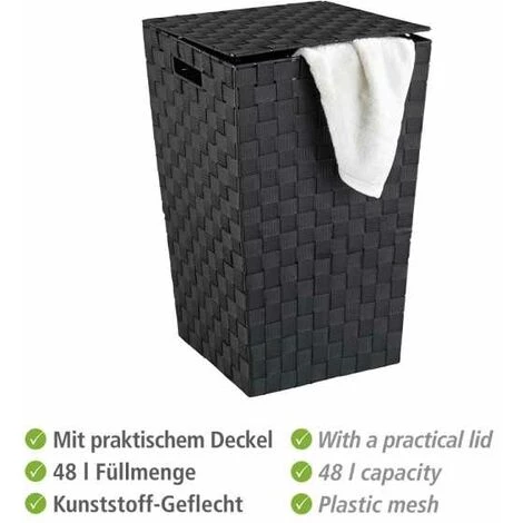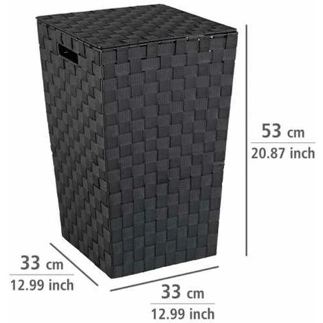 Le panier à linge noir Adria apparaît sous un nouveau look carré au tressage plastique haut de gamme. Il complète l’ameublement de chaque salle de bain par un élément à la fois décoratif et fonctionnel. Le panier à linge noir crée un espace de rangement supplémentaire pour le linge sale. Particulièrement ingénieux, le couvercle empêche les regards indiscrets sur le contenu du bac à linge. Le panier à linge a une capacité de 48 litres. Dimensions (L x H x P) : 33 x 53 x 33 cm