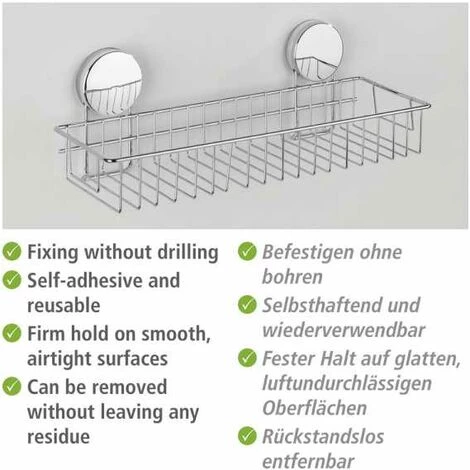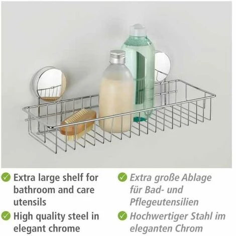 - Étendue de la livraison : Tablette maxi Static-Loc Plus Osimo de WENKO, en acier chromé, fixations Static-Loc Plus, force de traction jusqu’à 10 kg, dimensions (L x h x l) : 35 x 13 x 13 cm, profondeur intérieure du panier de 10 cm