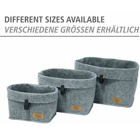- Étendue de la livraison : 1 x panier en feutre Feli taille L de WENKO, panier en 100% polyester avec un bord relevé, bride marron en similicuir, (L x h x l) : 30 x 19 x 18 cm, hauteur de 25 cm avec bord relevé, gris