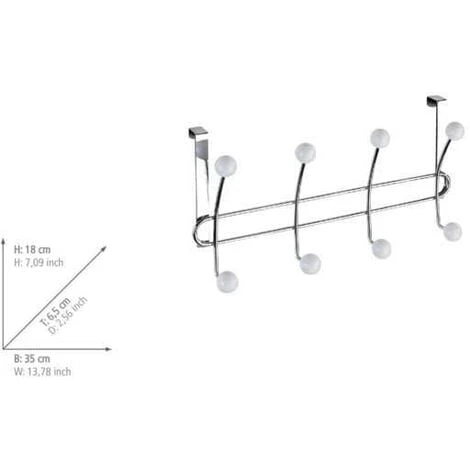 Enfin une tringle de porte à la fois élégante et décorative. De qualité supérieure et peu encombrante, la tringle de porte Lissa de WENKO prend en charge aisément chaque blouson et chaque manteau. Le montage est très facile, car la tringle s’accroche commodément sur la porte – sans percer de trous, sans vis et sans clous. La tringle à crochet de porte est adaptée pour les feuillures de porte de 2 cm max. La porte continue à se fermer sans problème malgré la garde-robe suspendue. Le matériau utilisé est de l’acier brillant. Les huit extrémités des crochets sont munies de très belles billes décoratives en matière plastique. La combinaison moderne des couleurs chrome et blanches fait naître dans chaque pièce une ambiance harmonieuse. La réglette de crochets peut ainsi être montée souplement dans les vestibules, les chambres à coucher ou encore les salles de bain. Ses huit crochets robustes sont parfaitement appropriés pour suspendre des vestons, des manteaux, des serviettes à main et des peignoirs.l: 35 cm x H: 18 cm x P: 6,5 cm