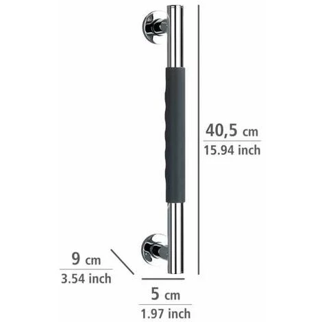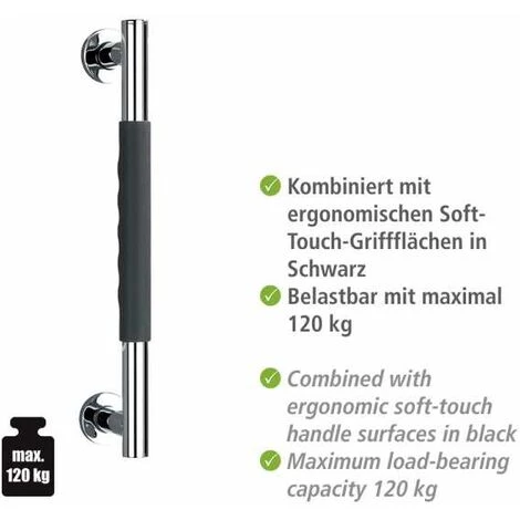 Les produits de la série Secura de WENKO facilitent le quotidien et offrent même aux personnes à mobilité restreinte la possibilité de relever en toute autonomie les défis quotidiens de l’hygiène corporelle. La recherche résolue de sécurité et de confort – découvrez notre vaste assortiment Secura. Nos poignées de maintien de salle de bain sont parfaites en tant qu’aides à l’équilibre pendant la douche, le bain ou au WC et vous garantissent une stabilité à toute épreuve dans toutes les situations. Désormais, plus de difficultés pour s’asseoir et se lever : La poignée murale de maintien Secura, de 40,5 cm de long, peut être montée librement sur un mur de la salle de bain. Grâce à la fiable poignée de sécurité de salle de bain de WENKO, vous pourrez entrer et sortir de la baignoire facilement et sans l’aide d’un tiers. La confortable poignée murale de maintien est également à tout moment utile à côté du WC. La poignée de maintien peut supporter une charge maximale de 120 kg. La poignée de maintien homologuée par le TÜV est fabriquée en acier inoxydable lourd et de qualité supérieure, qui est combiné à des surfaces de préhension ergonomiques Soft-Touch en noir tendance. La livraison contient des vis et des chevilles pour la fixation.