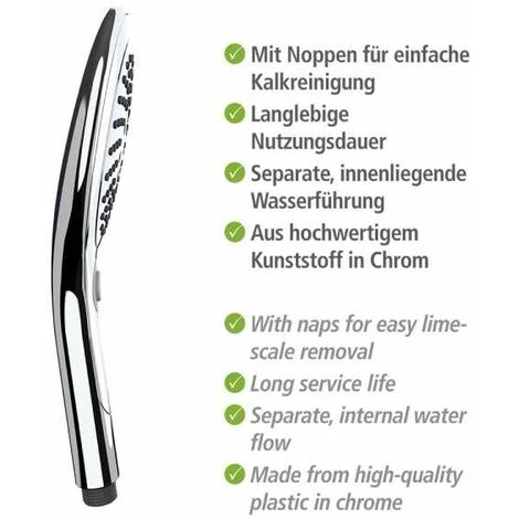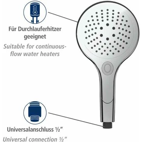 L’innovante gamme de pommettes de douche de WENKO convainc par sa fonctionnalité, son design et sa qualité. En un rien de temps, transformez votre salle de bain en une oasis de bien-être avec sensation de spa – quelle que soit la douchette WENKO que vous choisissez ! Avec la douchette Basic Universal, vous êtes parfaitement équipé. Car, en plus de la fonction jet pluie, qui vous détend comme une pluie tropicale douce et agréable, vous pourrez choisir parmi deux autres types de jet d’eau : Profitez de la fonction de massage revitalisant ou de la combinaison réussie de douche à effet pluie et de massage, selon votre force de jet d’eau préférée. Particulièrement astucieux : le pratique bouton-poussoir intégré pour le réglage facile des fonctions. Un simple clic sur le bouton confort suffit pour vous permettre de changer aisément le type de jet souhaité. La grande pomme de douche de 150 mm de diamètre garantit un plaisir de douche XXL. La pomme de douche classique est fabriquée en ABS robuste et enrobée de chrome brillant au fini argent. Ceci confère à la salle de bain un design élégant sans époque. Pourvue de picots pratiques qui garantissent un nettoyage aisé du calcaire, la pomme de douche offre une longue durée de vie. Les éventuels dépôts calcaires sur les buses peuvent être facilement éliminés avec les doigts. La pommette de douche commode dispose d’un raccord universel de ½ » et convient bien évidemment aussi aux chauffe-eau instantanés. Toutes les pommettes de douche de la gamme Basic sont pourvues d’un circuit d’eau interne séparé et sont bien évidemment fabriquées selon les directives KTW et W270. L’assortiment de WENKO vous propose également le tuyau de douche assorti, qui est disponible en plusieurs modèles. Complétez votre commande, de préférence dès maintenant, par votre favori ! Pour ce produit, vous bénéficiez d’une garantie de 3 ans à compter de la date d’achat. La garantie porte sur tous les vices de matériau et de fabrication qui altèrent le bon fonctionnement. Sont exclus les dommages résultant d’un maniement incorrect ou de l’usure naturelle. La garantie ne restreint aucunement vos droits à la garantie légaux. En cas de garantie, veuillez renvoyer gratuitement l‘article accompagné du ticket de caisse et convenablement emballé pour le transport à l‘adresse suivante : Wenko-Wenselaar GmbH & Co. KG · Abteilung « Retouren » Im Hülsenfeld 10 · 40721 Hilden, Allemagne [email protected]