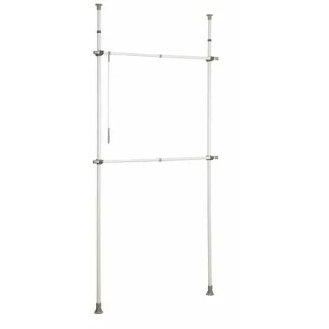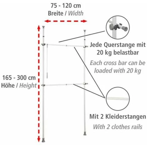 Variable, le système de rangement télescopique Herkules Basic est un miracle d’espace, qui crée sur deux barres porte-vêtements beaucoup d’espace de rangement pour vos vêtements préférés. Vous pourrez ainsi réaliser dans pratiquement chacune de vos pièces votre rêve de dressing. Les deux barres porte-vêtements garantissent vue d’ensemble et ordre. Elles sont en outre réglables en continu. Et chaque barre transversale peut porter 20 kg. Les barres porteuses s’allongent en hauteur de 165-300 cm. En largeur, le système s’adapte de 75-120 cm à la pièce. Avec le crochet pour vêtement fourni, il sera possible de parvenir même aux vêtements suspendus en hauteur. Le système de porte-vêtements télescopique, de qualité particulièrement lourde, est fabriqué en barres métalliques peintes par poudrage et combinées avec des éléments de raccordement en matière plastique grise de qualité supérieure. Le montage et l’encastrement sont également faciles comme un jeu d’enfants. Le système de rangement de vêtements peut être calé entre le plafond et le plancher sans aucun outil et sans devoir percer des trous.