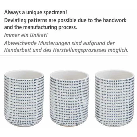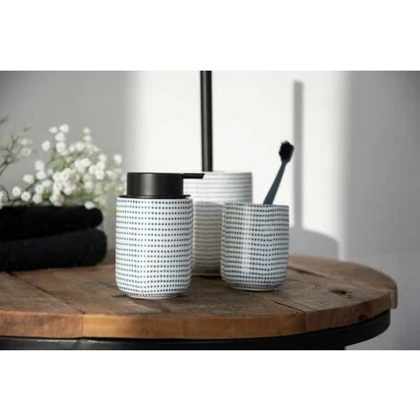 En plein dans le mille et avec goût ! Les accessoires de salle de bain de la série Nole placent des accents dynamiques dans la salle de bain et le WC d’invités. Le motif à points, toujours tendance, est extravagant, sans avoir l’air surchargé, et confère à votre salle de bain une esthétique parfaite. Tous les accessoires sont fabriqués en céramique blanche de qualité supérieure avec des pointillés bleus, l’ensemble étant complété par des détails noirs. Particulièrement original : chaque article affiche des dessins tendrement réalisés à la main. Le charmant ensemble WC Nole, à l’installation variable, nettoie votre WC en profondeur et sans aucun problème. La brosse vous garantit une utilisation fiable et propre grâce à ses soies à la fois robustes et flexibles. La brosse WC fournie dans la livraison est munie d’une tête noire remplaçable de Ø 8 cm. De plus, l’ensemble est doté d’un revêtement souple en matière plastique noire. Complétez votre ameublement de salle de bain par le gobelet à brosser les dents et le distributeur de savon assortis de la série Nole. Votre salle de bain à domicile se transformera ainsi en une véritable oasis de bien-être.