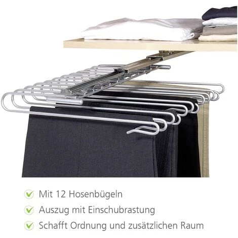 - Inclus dans la livraison : porte pantalons coulissant pour 12 pantalons, rail coulissant avec fermeture à glissière, à monter dans l’armoire, matériel de fixation inclus, acier chromé, dimensions (L x H x P) : 33 x 10 x 47 cm, 2 éponges de nettoyages offertes.
