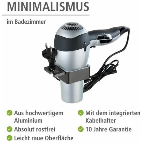 Minimalisme dans la salle de bain – la série d’accessoires de salle de bain Montella allie des formes claires à des matériaux de haute qualité, et suit la tendance du mobilier puriste avec des accents de couleurs foncées. Le design rectangulaire ave c des bords arrondis et la surface légèrement rugueuse confèrent à la série un aspect particulièrement moderne. Entièrement en anthracite, les accessoires ne garantissent pas seulement l’ordre, ils apportent aussi un design élégant dans la salle de bain. Fabriquée en aluminium de haute qualité, la série Montella est absolument inoxydable et peut parfaitement être utilisée dans les locaux humides. Avec le porte-sèche-cheveux ouvert de la série, le sèche-cheveux se range facilement et est à tout moment à portée de main. Un insert en plastique à l’intérieur du récipient protège le sèche-cheveux contre les rayures. Grâce au porte-câble intégré, le câble peut être accroché bien en ordre. Le porte sèche-cheveux se monte au mur à l’aide de vis et de chevilles. Le matériel de fixation est compris dans la livraison. D’autres articles de la série Montella de WENKO sont disponibles pour cet accessoire. Pour ce produit, vous bénéficiez d’une garantie de 10 ans à compter de la date d’achat. La garantie porte sur tous les vices de matériau et de fabrication qui altèrent le bon fonctionnement. Sont exclus les dommages résultant d’un maniement incorrect ou de l’usure naturelle. La garantie ne restreint aucunement vos droits à la garantie légaux. En cas de garantie, veuillez renvoyer gratuitement l‘article accompagné du ticket de caisse et convenablement emballé pour le transport à l‘adresse suivante : Wenko-Wenselaar GmbH & Co. KG · Abteilung « Retouren » Im Hülsenfeld 10 · 40721 Hilden, Allemagne [email protected]