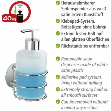 - Idéal pour la salle de bain et les WC : une légère pression sur la tête de pompe chromée permet de distribuer le savon de manière dosée grâce à la tête de pompe profilée. Le porte-brosse à dents offre un rangement à portée de main.