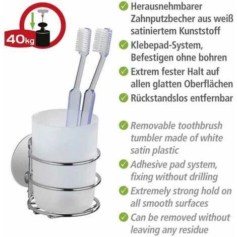 Le système de fixation murale Turbo-Loc® propose des accessoires et des tablettes décoratifs, qui se fixent facilement au mur – sans vis, sans percer de trous et sans chevilles. L’élément pratique : L’étagère de salle de bain et le lavabo restent libres et vous pouvez utiliser l’espace pour d’autres ustensiles de salle de bain. Le distributeur de savon et le gobelet à brosser les dents sont fabriqués en matière plastique satinée blanche. Le support chromé, de qualité lourde et robuste, a une prise ferme sur l’accessoire de salle de bain. Le gobelet à brosser les dents décoratif Turbo-Loc® se caractérise par une qualité solide en acier chromé. Le gobelet à brosser les dents tient brosses à dents et pâte dentifrice à tout moment à portée de main. Au surplus, les ustensiles de soins dentaires gagnent un emplacement ordonné. Le distributeur de savon liquide peut être rempli à volonté de 285 ml max. de savon liquide. Une légère pression sur la tête de pompage chromée suffit pour délivrer savon, lotion de lavage et lotion par le mince bec verseur. La meilleure caractéristique : Les résidus de savon sur le bord du lavabo font ainsi partie du passé. La fixation est un jeu d’enfants. La fixation murale Turbo-Loc® est un système de collage offrant une adhérence extrêmement forte sur toutes les surfaces lisses. Décoller simplement le film de protection du tampon autoadhésif, fixer le support à l’endroit souhaité et presser. Ensuite, il ne reste plus qu’à accrocher l’accessoire. Le tampon adhésif se décolle à nouveau sans laisser de traces. Grâce au système de tampon adhésif spécial, les crochets de fixation peuvent chacun résister à une force de traction atteignant 40 kg.