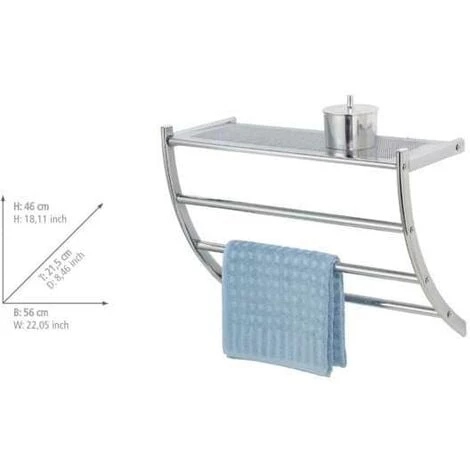 Deux en un – décorative et pratique, l’étagère murale salle de bain chromée Pescara offre sur une tablette perforée de style un emplacement pour poser des articles cosmétiques, des accessoires de bain ou encore une tablette supplémentaire pour les serviettes. En raison de sa forme arquée, les trois barres porte-serviettes sont disposées en escaliers et créent des intervalles aérés entre les serviettes ou les vêtements suspendus. L’étagère se monte au mur. Des vis et des chevilles sont fournies.l: 56 cm x H: 46 cm x P: 21,5 cm